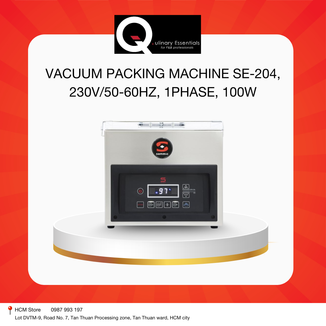 From the renowned brand Sammic, the SE-204 vacuum packing machine is one of the most advanced and efficient solutions on the market. This innovative machine removes air and oxygen — the main culprits of food spoilage — from packaging, thereby extending the shelf life of food by 2 to 4 times compared to conventional storage methods.